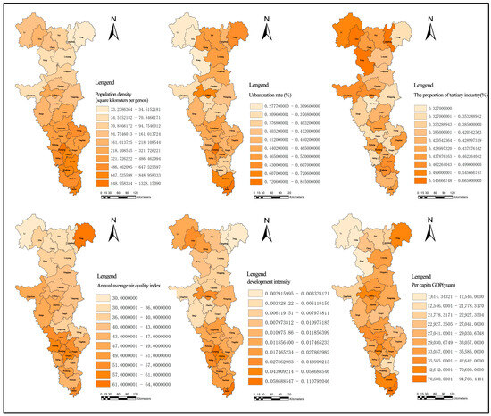 At the level of social development needs, the larger the urban population and the higher the level of regional economic development, the greater the demand for GI service provision [59]. Considering the relevance and availability of data, the selected indicators include per capita GDP, urbanization rate, and the proportion of the tertiary industry’s output value. Per capita GDP reflects the region’s consumption capacity, which indicates the demand for GI functions (such as cultural and recreational functions). The urbanization rate and the proportion of the tertiary industry reflect the intensity of demand for environmental quality and tourism aesthetics in the region.