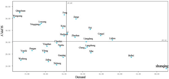 Based on the quadrant classification, the spatial matching pattern of GI supply and demand in the Jialing River Basin is illustrated in Figure 7, Figure 8 and Figure 9. The results revealed notable regional disparities in the supply–demand relationship: