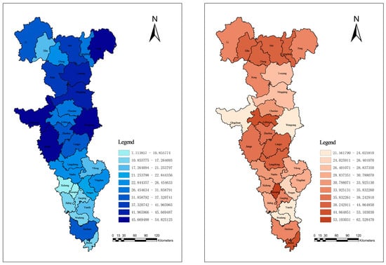 GI supply index (left) and demand index (right) of counties in Jialing River Basin.