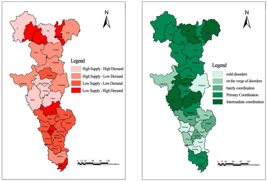 Due to differences in economic strength, population density, and development intensity across counties in the Jialing River Basin, mismatches occurred between GI supply levels and ecological demand. Based on the above analysis, the quadrant-based mismatch typology and the coupling coordination degree model were applied to spatially match the comprehensive GI supply level with the social demand level. This approach classified the counties within the Jialing River Basin into four types of supply–demand matching categories. Additionally, the coupling coordination analysis further divided the coordination degrees into three major categories and five subcategories (Table 5). This classification provided a comprehensive spatial understanding of the ecological and socio-economic dynamics of the Jialing River Basin, offering valuable guidance for region-specific GI planning and management strategies.