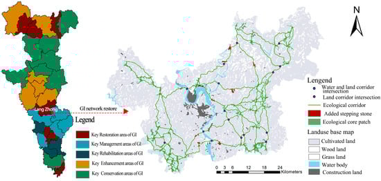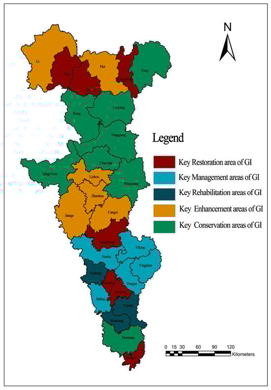 Based on the above analysis and considering the geographic, climatic, and socio-economic heterogeneity of the Jialing River Basin, the study area was divided into five optimization zones at the county level, focusing on GI restoration, conservation, and monitoring. Priority measures were implemented in GI network restoration and rehabilitation zones, where proactive ecological restoration policies were adopted to expand GI coverage, optimize spatial configurations, and enhance functional performance. For management and conservation zones, stricter protection and control measures were enacted to mitigate further ecological degradation. In enhancement zones, long-term dynamic monitoring systems were established to enable real-time adjustments to ecological strategies (Figure 10).