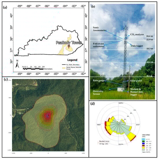 (a) Map of Kentucky showing Daniel Boone National Forest and the Peabody flux site, Clay County, Kentucky (37°8′17.16″ N, 83°34′46.82″ W); (b) Peabody Flux tower showing the instruments mounted; (c) Flux tower footprint estimate of the site (+) at a measurement height of 26.43 m, displacement height of 8.04 m, and a roughness length of 1.8 m, with contour lines from 10 to 90% (red lines), in 10% steps; and (d) Windrose showing the predominant wind speed and direction coming into the flux tower.