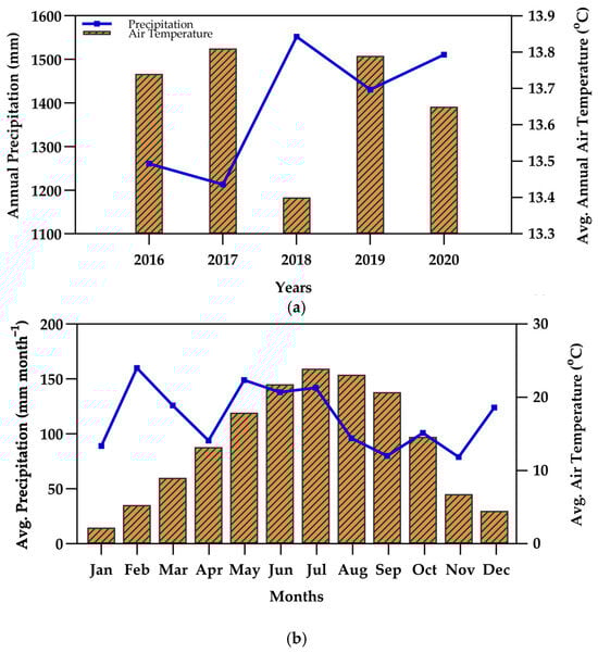 (a) Annual average air temperature (Tair, °C) and precipitation “mm”; (b) Monthly average air temperature (°C) and average and total precipitation “mm” at the Daniel Boone National Forest average from 2016 to 2021.