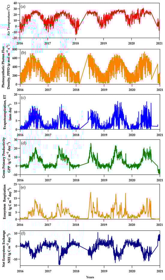 (a) Daily average of air temperature (°C), (b) Photosynthetic Photon Flux Density (PPFD, µmol m−2s−1), (c) Evapotranspiration (mm day−1), (d) Gross Primary Productivity (GPP, g C m−2s−1), (e) Ecosystem Respiration (RE, g C m−2s−1), and (f) Net Ecosystem Exchange (NEE, (g C m−2s−1).