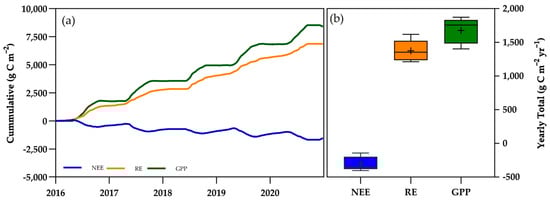 (a) Cumulative GPP, RE, and NEE (g C m−2 yr−1) aggregated over five years of observations (2016–2020); (b) Box and Whisker plot showing the dispersion of all annual cumulative fluxes of GPP, RE, and NEE (g C m−2) with average (+).