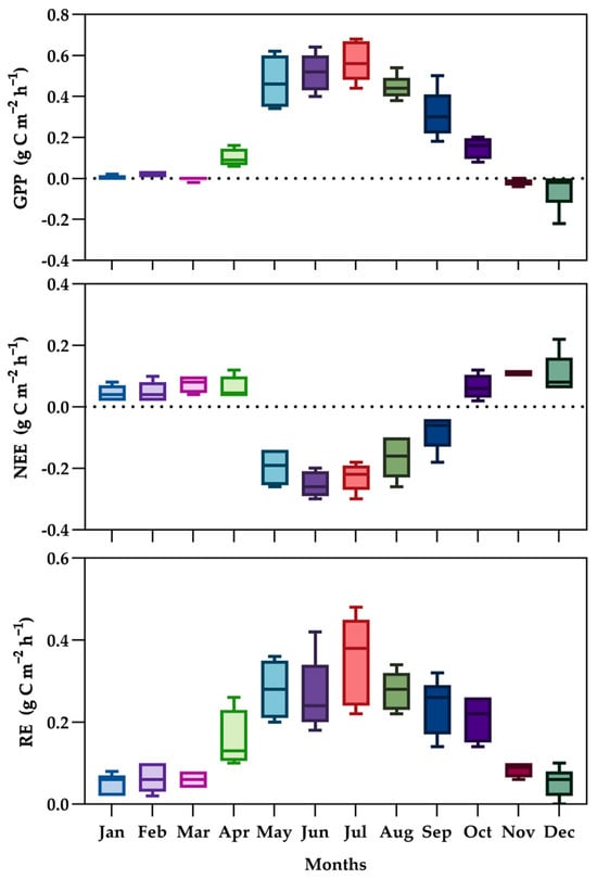 Monthly rate of Gross Primary Productivity (GPP, g C m−2 h−1), Ecosystem Respiration (RE, g C m−2 h−1), and Net Ecosystem Exchange (NEE, g C m−2 h−1) for all the years under study.