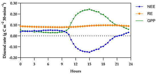 Diurnal rate of Gross Primary Productivity (GPP), Ecosystem Respiration (RE), and Net Ecosystem Exchange (NEE). Unit represented as g C m−2h−1.