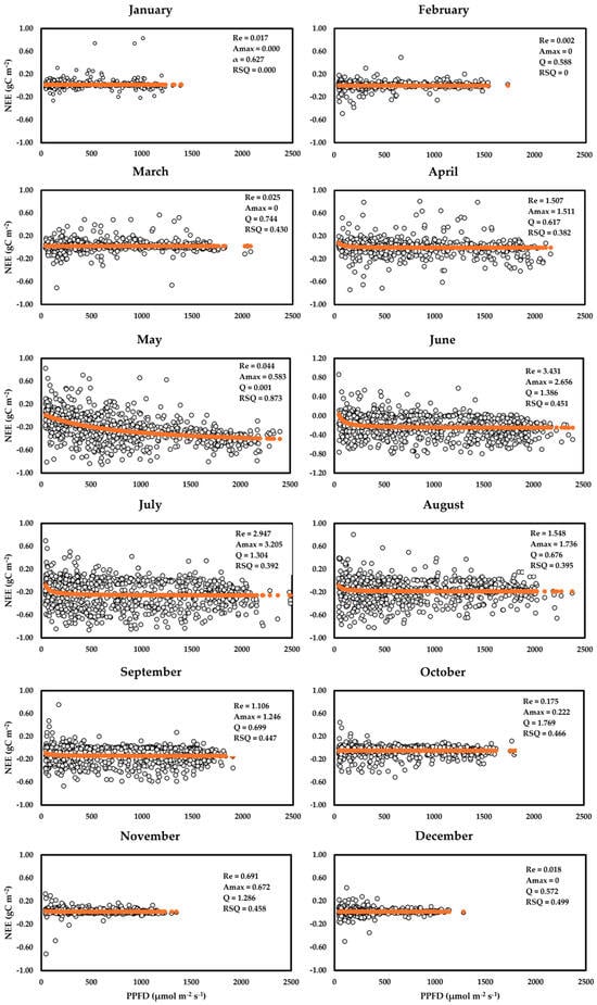 The Michaelis–Menten (light response) model was used to assess the response of Net Ecosystem Exchange (NEE) to light intensity (PPFD) for a typical year in the study period. 2016 was selected because it had a complete dataset, with average temperature and precipitation typical for the area under study. The maximum photosynthetic rate at saturated light (Amax) was lowest in the winter months and peaked in the growing season, with July (3.205 g C m−2 s−1) being the highest (Table 3). The Amax pattern also coincided with the apparent quantum efficiency (∝) distribution and the amount of carbon expended for respiration. The months with high ∝ and Amax showed a clear link with the amount of photosynthetically active light, with mean PPDD highest at those months. In particular, June had the highest PPFD (986.26 µMol/m2), the highest RE rate (3.431 gC m−2s−1) (Figure 7), and the highest quantum efficiency (1.386), and also high total NEE (−175.644 gCm−2). This indicates that the seasonal availability of light and its intensity variability influences the amount of carbon uptake and carbon usage for the forest ecosystem.