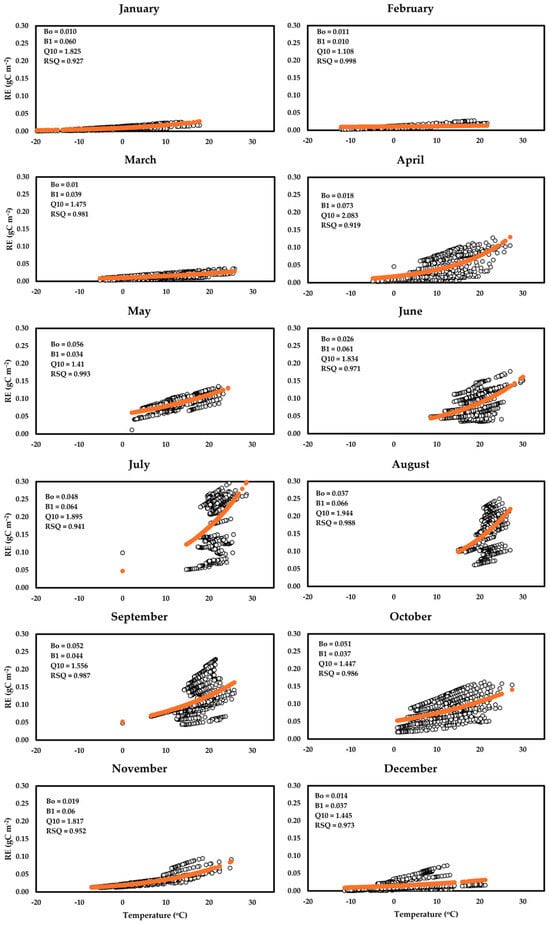 The fitted parameters of the temperature response curves for respiration in the study area for the year 2016 (Equation (6)) are shown in Table 4 and Figure 8. The intercept variable (), which indicates the respiration rate at 0 °C, showed that for all the months, respiration occurred even at low temperatures. The improves as the season shifts towards the middle of the year. The slope parameters () followed a similar pattern as . The monthly temperature coefficients (Q10) shown in Equation (7) demonstrate that respiration rates almost doubled (1.65 ± 0.29) with every 10 °C increase.