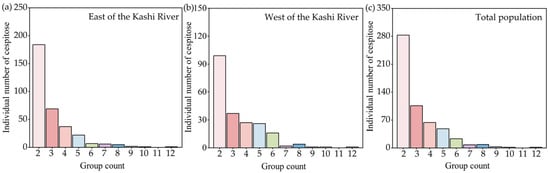 Distribution of the number of cespitose groups and cespitose plants of F. sogdiana from (a) the east of the Kashi River, (b) the west of the Kashi River, and (c) the total population.