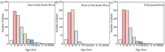 The age structure of the cespitose F. sogdiana population from (a) the east of the Kashi River, (b) the west of the Kashi River, and (c) the total population.