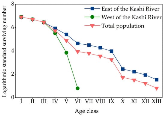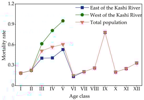 The mortality rate curve of the east of the Kashi River population and the total population had the same trend (Figure 4). The peak mortality occurred in age class IX (0.783 and 0.783), and the second peak mortality occurred in age class V (0.531 and 0.607). The mortality rate curve of the west of the Kashi River population showed an increasing trend. It reached the maximum mortality rate at age class V (0.952). This indicates that the age class and frequency of environmental screening experienced by the cespitose F. sogdiana population in different habitats differed. Still, they all suffered more intense environmental screening in age class V.