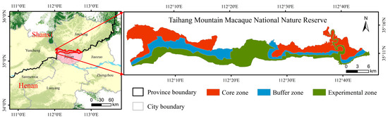 The Taihang Mountains Macaque National Nature Reserve is located in northwestern Henan Province, China, on the southern slope of the Taihang Mountain (34°54′–35°16′ N, 112°02′–112°52′ E), covering approximately 15,572 hectares [51]. The functional zoning of the protected area is shown in Figure 1. The climate is classified as semihumid or semiarid continental monsoon. The annual average temperature is 14 °C [52], with an annual sunshine duration of 1727.6 h and an annual precipitation of 860 mm [53]. The region is predominantly hilly and mountainous, with soil types consisting mainly of brown and cinnamon soils, which are typically acidic or neutral [54]. The main vegetation species in the area include Quercus aliena var. acutiserrata, Quercus variabilis, Pistacia chinensis, and Carpinus turczaninovii [53,54,55], as shown in Table 1.