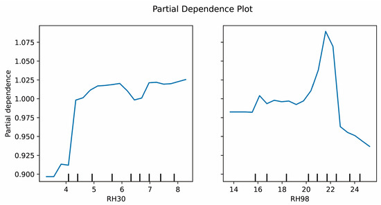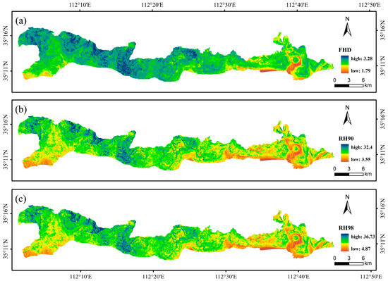 The modeling results are presented in Table 11, where FHD, RH90, and RH98 presented higher accuracies than the other parameters did, with R2 values exceeding 0.5, whereas RH10 presented the lowest accuracy, with an R2 of only 0.351. Some interpolation results are shown in Figure 4.