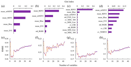 Results of the joint remote sensing feature screening analysis. (a,e) Gini importance ranking and RFE results for the H index, respectively; (b,f) Gini importance ranking and RFE results for the D index, respectively; (c,g) Gini importance ranking and RFE results for the J index, respectively; and (d,h) Gini importance ranking and RFE results for the S index, respectively.