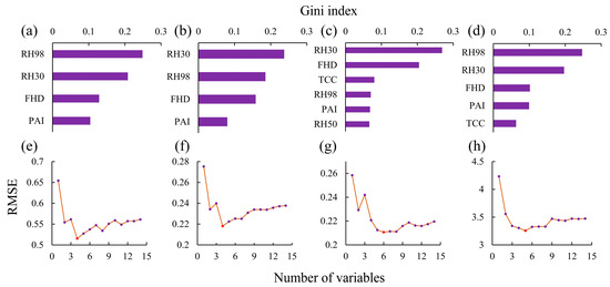 As shown in Figure 6, the optimal number of variables for the H index was four, comprising RH98, RH30, FHD and PAI. For the D index, the optimal number of variables was also four, comprising RH98, RH30, FHD, and PAI. For the J index, six variables were found to be optimal: RH30, FHD, TCC, RH98, PAI, and RH50. Finally, the optimal number of variables for the S index was five, and the selected variables were RH98, RH30, FHD, PAI, and TCC.
