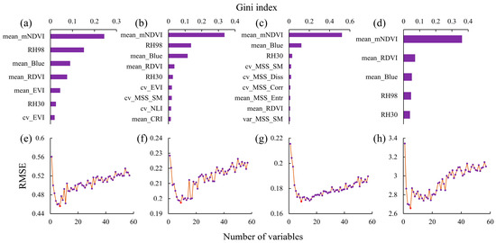 Vertical remote sensing feature screening results. (a,e) Gini importance ranking and RFE results for the H index, respectively; (b,f) Gini importance ranking and RFE results for the D index, respectively; (c,g) Gini importance ranking and RFE results for the J index, respectively; and (d,h) Gini importance ranking and RFE results for the S index, respectively.
