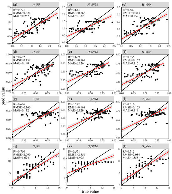 Scatter plots of the true and predicted values of the four diversity indices as determined by the RF, SVM and kNN models. (a–c) RF, SVM, and kNN predictions for the H diversity index; (d–f) RF, SVM, and kNN predictions for the D diversity index; (g–i) RF, SVM, and kNN predictions for the J diversity index; (j–l) RF, SVM, and kNN predictions for the S diversity index.