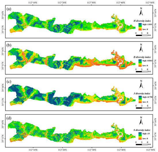 On the basis of the modeling results from the three machine learning models, the RF model was ultimately selected. Using the GF-1 and GEDI fusion features, terrain features, climate features, and annual maximum NDVI, the RF model was applied to map the H, D, J, and S indices of the tree species in the study area (Figure 9). The results indicate strong spatial heterogeneity in forest tree species diversity across the study area. Spatially, the prediction maps reveal notable consistency between the H index and the D index. The values of the four indices were predominantly distributed at moderate levels, with fewer values at both the lower and higher extremes. Overall, the diversity levels followed a spatial distribution pattern, with higher diversity in the west and lower diversity in the east.
