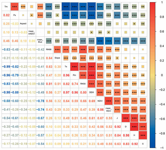 Using the SVH and the habitat heterogeneity hypothesis, the mean, standard deviation (std), variance (var), and coefficient of variation (cv) of the 40 optical remote sensing feature variables were calculated at a scale of 20 × 20 m to quantify the spatial heterogeneity of the forest canopy spectral characteristics. To reduce model redundancy and minimize the impact of feature correlation, features with a correlation coefficient R > 0.8 were removed, leaving 43 variables.