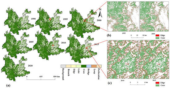 Morphological spatial pattern analysis (MSPA) proficiently identifies the spatial patterns of connecting features [53]. It is used to investigate forest expansion and loss, providing a more detailed explanation of changes in forest landscape patterns and patches (Figure 3). MSPA, based on morphological principles, divides the study area’s landscape into foreground (forest) and background (nonforest) for assessment, identification, and segmentation. This study used land-use data from 1990 to 2020 [48] to classify forest landscapes in the GUIDOS (v1.9.5) software (https://forest.jrc.ec.europa.eu/en/activities/lpa/gtb/, accessed on 1 January 2024) based on the green infrastructure theory, generating seven types of landscape maps with a 30-m spatial resolution, each spanning a five-year interval. Each type has specific ecological significance (Table 3). This method improves classification accuracy and provides a scientific basis for forest management and conservation strategies.
