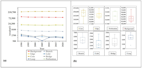 MSPA analysis reveals the spatial distribution of Yunnan’s forest landscape over 30 years (Figure 3) and the changes in area (Figure 4). MSPA analysis, based on land-use data, classifies forest landscapes into seven types. In Yunnan, land-use data from 1990 to 2020 helped distinguish forest patterns. Changes in the forest landscape were due to land-use changes, not image-acquisition technology or sensors. Thus, the changes in the area’s landscape patterns mainly reflect those of the seven forest-landscape types. Spatially, the core forest dominates, accounting for 61.4% of the area, with an average size of 247,632.84 km2. Southwest and northwest Yunnan are the most concentrated core forest regions. The central and northeastern areas have more fragmented patches with many edge areas (average area 19,430.87 km2). Perforation, as the third largest forest landscape (average area 18,470.51 km2), is mainly distributed in the southwest and northwest, serving as one of the primary internal fragmentation methods and is less common in central. From 1995 to 2000, edge forest areas in central Yunnan increased (Figure 3b), and from 2010 to 2015, forest loss occurred in central areas (Figure 3c). Between 1990 and 2020, the area of forest landscape types showed opposing trends; the core forest area peaked in 2020 (253,143.26 km2) and was smallest in 1990 (235,314.85 km2). In contrast, the edge forest area was largest in 1990 (20,837.05 km2) and smallest in 2010 (18,672.79 km2). The area of perforation also followed a similar trend, the largest in 1990 at 19,111.79 km2 and the lowest in 2000 at 17,864.13 km2. This change suggests enhanced forest interior filling and natural regeneration during this period, improving forest continuity and ecological stability. Other forest landscape types (branch, islet, bridge) reached their maximum in 1990 and minimum in 2020. In 2005, the loop landscape area reached its smallest size (968.4675 km2). This was mainly because core areas expanded, squeezing edge zones and turning loop and other edge types into core types. At the same time, forest expansion connected isolated patches, reducing fragmentation. Therefore, the 2005 loop area drop was likely because these processes linked small, isolated loop areas to larger forest patches, changing them into other landscape types.