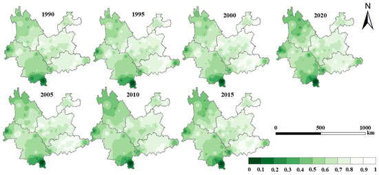 The fragmentation of forests can be represented by the forest fragmentation index (FFI) (Figure 5). Our study classifies forest fragmentation (FF) into five levels using the mean standard deviation method: extremely low (0–0.2), low (0.2–0.4), moderate (0.4–0.6), high (0.6–0.8), and extremely high (0.8–1). Areas with high and extremely high fragmentation are mainly in the northeast, southeast, and central regions; moderate fragmentation is predominantly in the southwest and northwest; while low and extremely low fragmentation occurs in southwestern areas like the Dai Autonomous Prefectures of Xishuangbanna and Dehong. Spatially, eastern regions have higher FF levels than western regions, with the southwest having the lowest. From 1990 to 2000, FF was low in the southern southwest and northern northwest but high in the central and northeast regions. From 2000 to 2020, the southwest had the lowest FF levels, while the central region had the highest; in 2015, the southeastern region had the highest level of FF. To better assess regional FF degrees, the average FFI for each region was calculated (Table 4). The data shows that Qujing City has the highest degree of fragmentation (0.762815286), and the Dai Autonomous Prefecture of Xishuangbanna has the lowest (0.320616429), with FF in central and eastern Yunnan generally being higher than in the western regions.