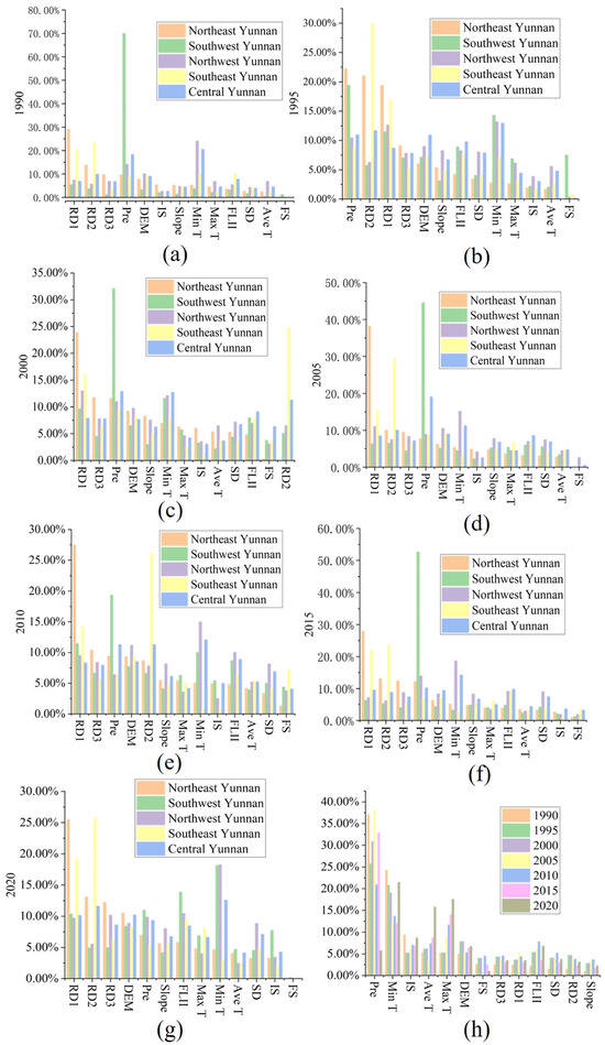 Driver factor analysis results. Here, (a–g) are the results of driving factor analysis in different regions of Yunnan Province from 1990 to 2020, and (h) is the overall driving factor of Yunnan Province in the past 30 years. Where RD1—Road distance, RD2—Residential distance, RD3—River distance, Pre—Precipitation, DEM—Digital elevation model, IS—Impervious surface, Min T—Minimum temperature, Max T—Maximum temperature, FLII—Forest landscape integrity index, SD—Slope direction, Ave T—Average temperature, FS—Fire site.