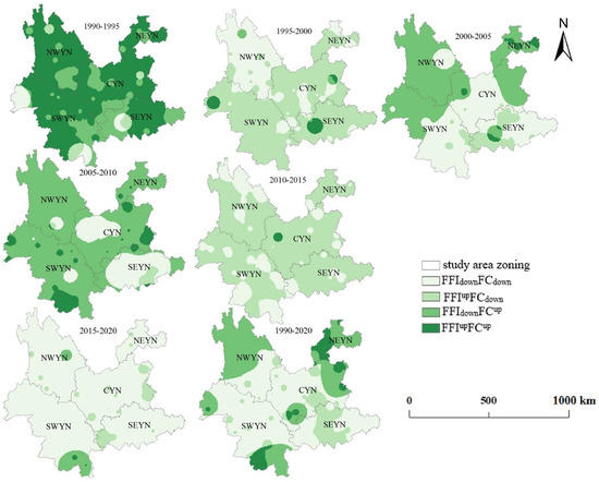 An analysis of the factors influencing the dynamic FFI indicates that policy factors have a considerable impact on the degree of FF. We find that before 2000, unrestrained deforestation by humans led to substantial forest loss. However, since 1998, the nation has embarked on extensive ecological construction efforts, initiating key forestry projects like natural forest conservation, the conversion of farmland back to forest, and the establishment of shelterbelt forests with substantial financial investment. The full-scale launch of the Natural Forest Resource Protection Project in 2000 has been instrumental in reducing FF [62], most notably in central Yunnan [58]. Rafael Antonio Chaparro Torre [63] also reported that in the central and eastern regions of Yunnan, the land degradation area is about 7979.7 square kilometers, with new urban districts and suburban growth areas being the most affected. Moreover, the Province also faced three consecutive years of severe drought from 2010 to 2013, further exacerbating forest degradation [64]. Between 2015 and 2020, urban expansion slowed down; the timely introduction of the “13th Five-Year Plan” forestry and grassland construction policy and the improvement of climate conditions are also combined factors that contributed to the slowing down of the degree of FF.