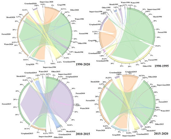 Land-use transfer matrix 1990–2020, where the years with significant changes are selected.