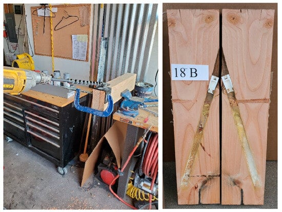 Air-dried and machined Coastal Douglas-fir heartwood timbers 102 × 152 mm (4 × 6-inch nominal) from ten different trees were purchased locally (Colorado Springs, CO). The wood was cut into 610 mm (24-inches) long sections that were randomly assigned to 15 different treatments. A 22.8 mm (7/8 inch) diameter by 356 mm (14 inch) long treatment hole was drilled at a 45-degree angle into each block at a site approximately 200 mm (8 inches) above the intended groundline (Figure 1).