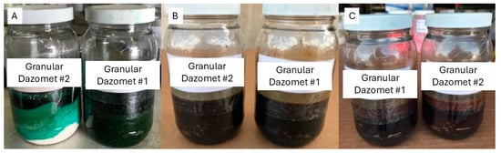 (A) Examples of penetration of the water-based 1% copper naphthenate accelerant into granular Formulations 1 and 2 shortly after chemical addition, (B) 24 h after accelerant addition, and (C) 30 days after accelerant addition, showing slightly faster penetration into Formulation 1.