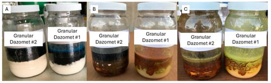 (A) Examples of penetration of water-based copper ethanolamine (2.5% as copper) and DOT (6.25%) through granular Formulations 1 and 2 shortly after chemical addition, (B) 24 h after accelerant addition, and (C) 30 days after accelerant addition, showing slower penetration than with the organic solvent-based accelerant system.
