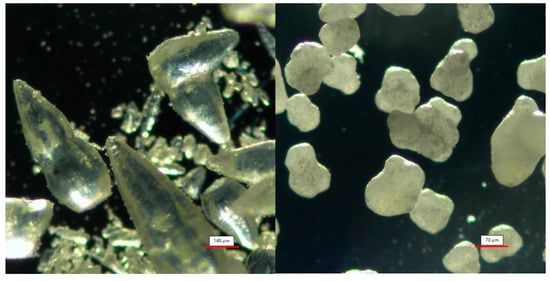 (Left) Light microscopic images of dazomet granules from Formulations 1 and 2 (left and right), showing differences in morphology and dimensions that might affect accelerant interactions.
