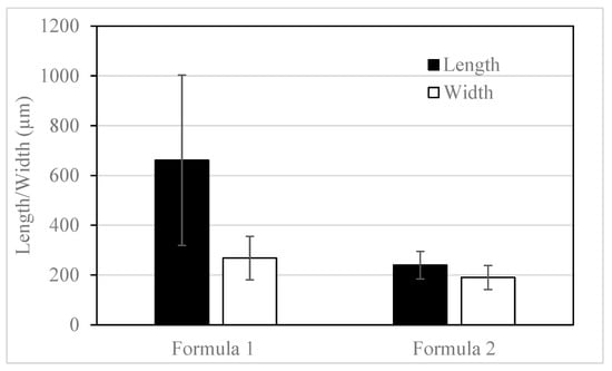 Average dimensions for 100 dazomet granules each from Formulations 1 and 2. Error bars represent one standard deviation.