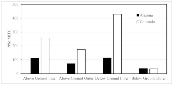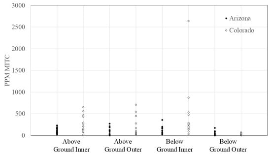 MITC levels trended lower at most sampling locations at the drier site in Arizona except in the below-ground outer sampling location. This is likely due to the higher moisture content maintained at the Colorado test site by supplemental watering. It is unclear why the outer zones below ground contained lower MITC levels at both sites, as moisture is a critical driver of dazomet decomposition. It is possible that the sampling point was too far below the bulk of the granular dazomet, and much of the gaseous MITC traveled away from that sampling point. The inner core sections tended to have higher MITC levels, and this is consistent with the previous studies []. The downward-sloping treatment holes likely enhanced the levels at these sites. MITC was present above the 20 ppm threshold in most samples, which has previously been shown to be the approximate threshold of inhibition for decay fungi in wood poles [].