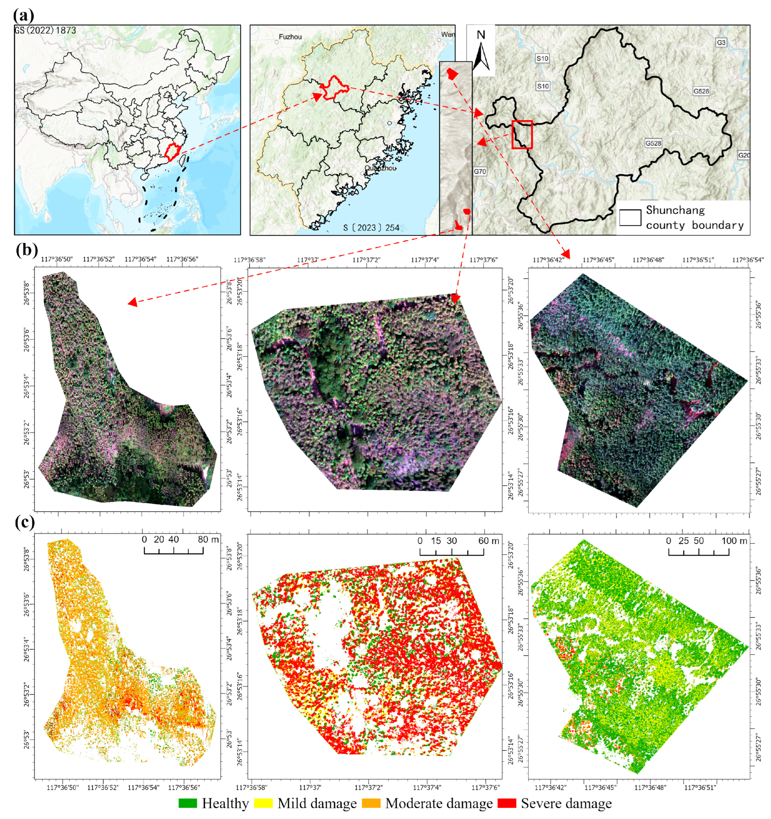 - He, A.Q.; Xu, Z.H.; Li, Y.F.; Li, B.; Huang, X.Y.; Zhang, H.F.; Guo, X.Y.; Li, Z.L. Monitoring Moso bamboo (Phyllostachys pubescens) forests damage caused by Pantana phyllostachysae Chao considering phenological differences between on-year and off-year using UAV hyperspectral images. Geo-Spat. Inf. Sci. 2025, 1–19. [Google Scholar] [CrossRef]