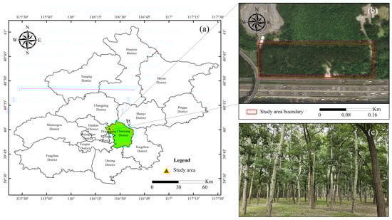 Figure 1. Illustration of the study area for DBH estimation using MLS: (a) location of study area; (b) satellite view of study area and its boundary. (c) The environment of target trees in the study area.