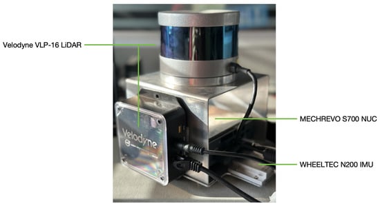 Figure 2. Core hardware system composition: a Velodyne VLP-16 LiDAR (Ouster Inc. in San Francisco, CA, USA), a WHEELTEC N200 IMU (WHEELTEC Inc. in Dongguan, China), and a MECHREVO S700 microcomputer (MECHREVO Inc. in Beijing, China).