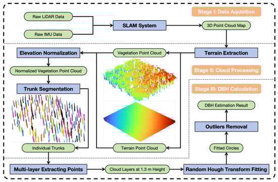 The proposed framework, as depicted in Figure 3, outlines the operational workflow of the system. The hardware system comprises a LiDAR sensor, an inertial navigation unit, and a microcomputer. The LiDAR and IMU acquire motion information and environmental observations, which are fed as raw data to the SLAM algorithm running on the microcomputer to reconstruct the three-dimensional point cloud map of the forest (Stage I). The vegetation point cloud is then distinguished from the ground points through terrain extraction and undergoes elevation normalization subsequently. Following this, a tree trunk segmentation algorithm is applied to the vegetation point cloud to isolate individual trunk point clouds. Each segmentation result is individually validated to ensure accuracy, yielding optimized trunk segmentation outcomes (Stage II in Figure 3). Finally, point cloud slices at a height of 1.3 m are extracted from each trunk, and circles are fitted using the Randomized Hough Transform (RHT) based on the points in these slices. After outlier filtering, the final DBH estimation results are obtained (Stage III).
