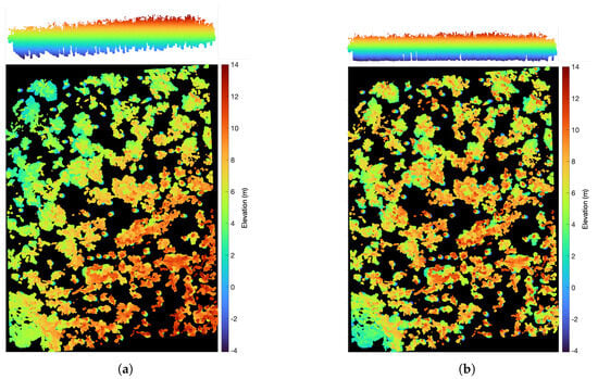 Figure 6. Elevation normalization for vegetation point cloud. (a) Horizontal perspective and overhead perspective of primitive vegetation point cloud. (b) Horizontal perspective and overhead perspective of normalized vegetation point cloud.