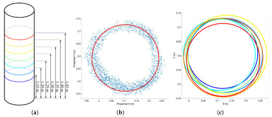 Figure 8. Illustration of the DBH calculation process. (a) Equidistant sampling of tree trunk point clouds at different height intervals, with each interval being 10 m in length, and the heights of the centers of each interval are given. (b) Projection of the point cloud within a layer onto the base plane of the tree along the main axis of the tree, followed by circle fitting. (c) Summary of the fitted circles.