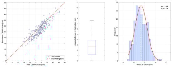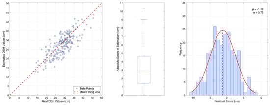 Figure 10. Estimation of DBH using our designed system. Left: Plot of 231 measured trees vs. estimated values, 1 tree was not segmented. Middle: Boxplot of the errors between the estimated and measured values, RMSE = 3.20 cm and MAPE = 9.72%. Right: Residual distribution plot and its normal fitting curve.