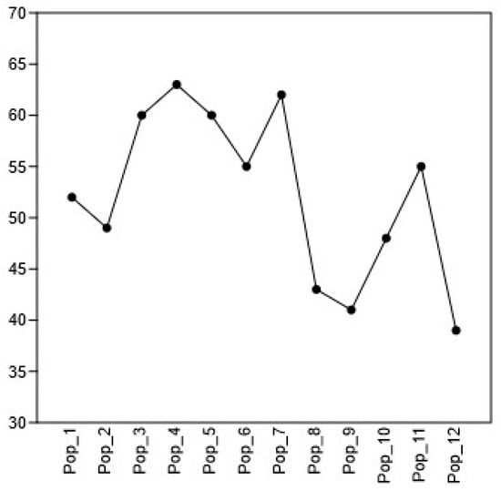 The graph presented in Figure 4 illustrates the alpha diversity (number of species) for the 12 studied populations (Pop_1–Pop_12). Pop_4, Pop_7, Pop_3, and Pop_5 stand out as having the highest species diversity, with the number of species exceeding 60. An average level of diversity is observed in Pop_1, Pop_2, Pop_6, Pop_10, and Pop_11, with the number of species varying from approximately 48 to 56. The lowest species richness is recorded in Pop_8, Pop_9, and Pop_12 (less than 45 species). These data confirm the presence of pronounced differences between populations in terms of species richness, emphasizing the importance of individual populations, especially the most and least diverse, when developing measures to conserve biodiversity.