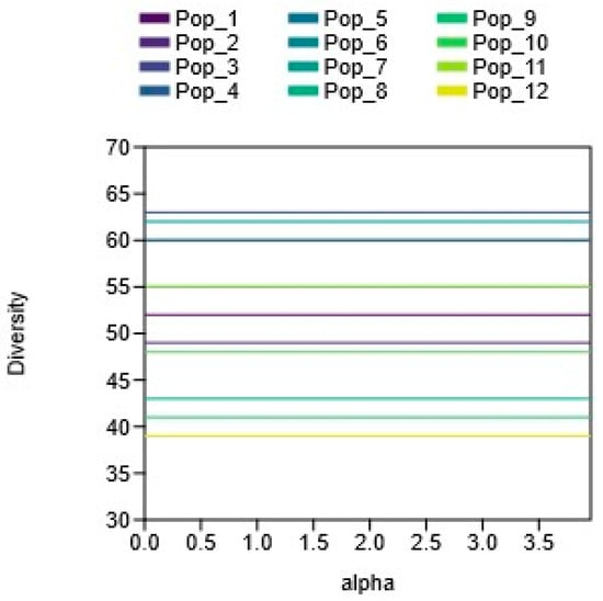 Alpha diversity of the C. ambigua population (Pop_1 Karasay, Pop_2 Kendirli, Pop_3 Emdikorgan, Pop_4 Tulkili-Sai, Pop_5 Akmysh, Pop_6 Samal, Pop_7 Zhemsem-Say, Pop_8 Sultan_Epe, Pop_9 Karakosayim, Pop_10 Kesim, Pop_11 Kogez, and Pop_12 Botakan).