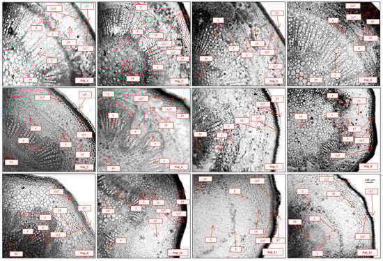 The following morphometric parameters of stems and leaves were used for statistical analysis. The stem parameters included epidermal thickness (ET, μm), which reflected the thickness of the outer protective layer of the stem; collenchyma thickness (CT, μm), characterizing the thickness of mechanical tissue that provided strength and elasticity to the stem; primary cortex thickness (PCT, μm), measuring the thickness of the parenchymal tissue located between the epidermis and vascular bundles; the area of the conducting bundle (CBA, ×10−3 mm2), indicating the size of the vascular–fibrous bundles responsible for water and nutrient transport; and the core parenchyma diameter (CPD, μm), which defined the size of the central part of the stem containing reserve nutrients. The leaf parameters included the upper epidermal thickness (UET, μm), measuring the thickness of the outer cell layer on the upper leaf surface that served a protective function; lower epidermal thickness (LET, μm), reflecting the thickness of the covering layer on the lower leaf surface where the stomata are often located; palisade mesophyll thickness (PMT, μm), which determined the thickness of the layer of densely arranged columnar cells responsible for photosynthesis; spongy mesophyll thickness (SMT, μm), measuring the thickness of the loosely arranged cells involved in gas exchange; and the area of the conducting bundle (SCB, ×10−3 mm2), characterizing the size of the vascular tissues in the leaves responsible for water and photosynthate transport. These parameters were used to analyze the influence of the altitudinal gradient on the anatomical features of the stems and leaves of the studied plants—Table 6 and Table 7 present the results of the descriptive statistics and a description of the main anatomical parameters.