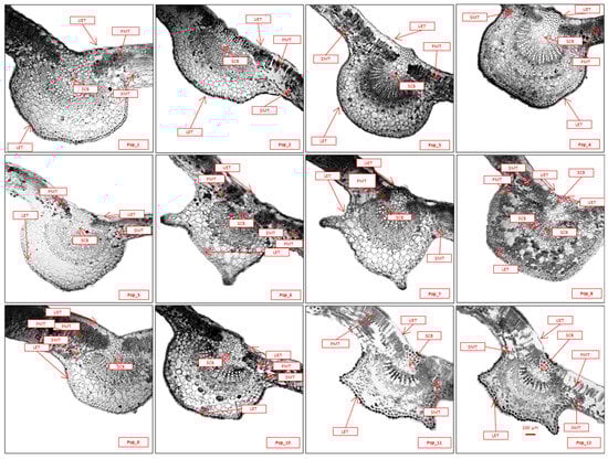 Anatomical structures of the middle sections of the leaves from the populations of C. ambigua (Pop_1 Karasay, Pop_2 Kendirli, Pop_3 Emdikorgan, Pop_4 Tulkili-Sai, Pop_5 Akmysh, Pop_6 Samal, Pop_7 Zhemsem_Say, Pop_8 Sultan_Epe, Pop_9 Karakosayim, Pop_10 Kesim, Pop_11 Kogez, and Pop_12 Botakan). Cross-section (fragment): upper epidermal thickness (UET), lower epidermal thickness (LET), palisade mesophyll thickness (PMT), spongy mesophyll thickness (SMT), and square of conductive bundle (SCB).
