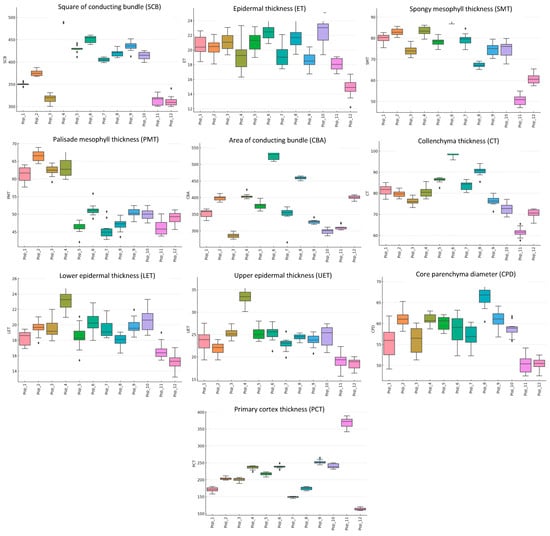 Box plot analysis of the anatomical traits of C. ambigua across 12 populations in the Mangystau Region: area of conducting bundle (SCB), epidermal thickness (ET), spongy mesophyll thickness (SMT), palisade mesophyll thickness (PMT), area of conducting bundle (CBA), collenchyma thickness (CT), lower epidermal thickness (LET), upper epidermal thickness (UET), core parenchyma diameter (CPD), and primary cortex thickness (PCT).