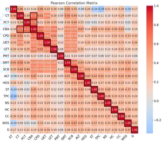 Pearson correlation coefficients based on the combined data of anatomical traits in the leaves and stems of C. ambigua across 12 populations in the Mangystau Region. The color scale ranges from −1 (strong negative correlation, shown in blue) to 1 (strong positive correlation, shown in red). The intensity of the color indicates the strength of the correlation between variables, with darker shades reflecting stronger relationships. The matrix includes the following variables: epidermal thickness (ET), collenchyma thickness (CT), primary cortex thickness (PCT), conducting bundle area (CBA), core parenchyma diameter (CPD), upper epidermal thickness (UET), lower epidermal thickness (LET), palisade mesophyll thickness (PMT), spongy mesophyll thickness (SMT), square of conductive bundle (SCB), altitude above sea level (ALT), height of gorge slopes (HGS), soil type (ST), total projective cover (TPC), number of species in the community (NS), humus content (HC), carbonate content (CC), amount of water-soluble salts (WSS), and grazing livestock (G).