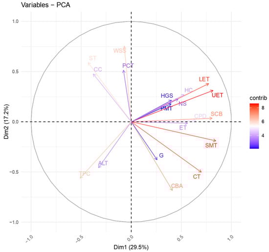 The first principal component (Dim1) explains 29.5% of the data variation, and the second (Dim2) explains 17.2%, accounting for 46.7% of the total variation. The longer the vector, the more significant the contribution of the variable to the corresponding principal component. Vectors pointing in the same direction are correlated, while variables perpendicular to each other are weakly related. Oppositely directed vectors indicate a negative correlation. The variables located on the right side of the graph (UET, LET, SMT, SCB, PCT) are positively correlated with the first principal component and probably reflect adaptive changes in leaf anatomy under certain conditions. At the same time, the gorge slope altitude (HGS), the number of species in the community (NS), the humus content (HC), and the grazing load (G) are opposite to these traits, indicating the influence of environmental factors on their variability. Along the Dim2 axis, the amount of water-soluble salts (WSS), carbonate content (CC), altitude (ALT), and soil type (ST) have a significant effect. The main findings indicate that populations with a high humus content and a more diverse plant community (HC, NS) tend to have anatomical differences compared to populations located at an altitude with high levels of water-soluble salts (WSS) and an intense grazing load (G). The anatomical characteristics of leaves, such as the thickness of the upper and lower epidermis (LET, UET) and the spongy parenchyma (SMT), are closely related and may be adapted to different environmental conditions. Environmental factors, including altitude, soil type, and carbonate content, significantly affect the variability of anatomical traits. This analysis allows us to identify the key factors that determine the anatomical structure of C. ambigua and provides insight into the mechanisms by which the species adapts to different environmental conditions.